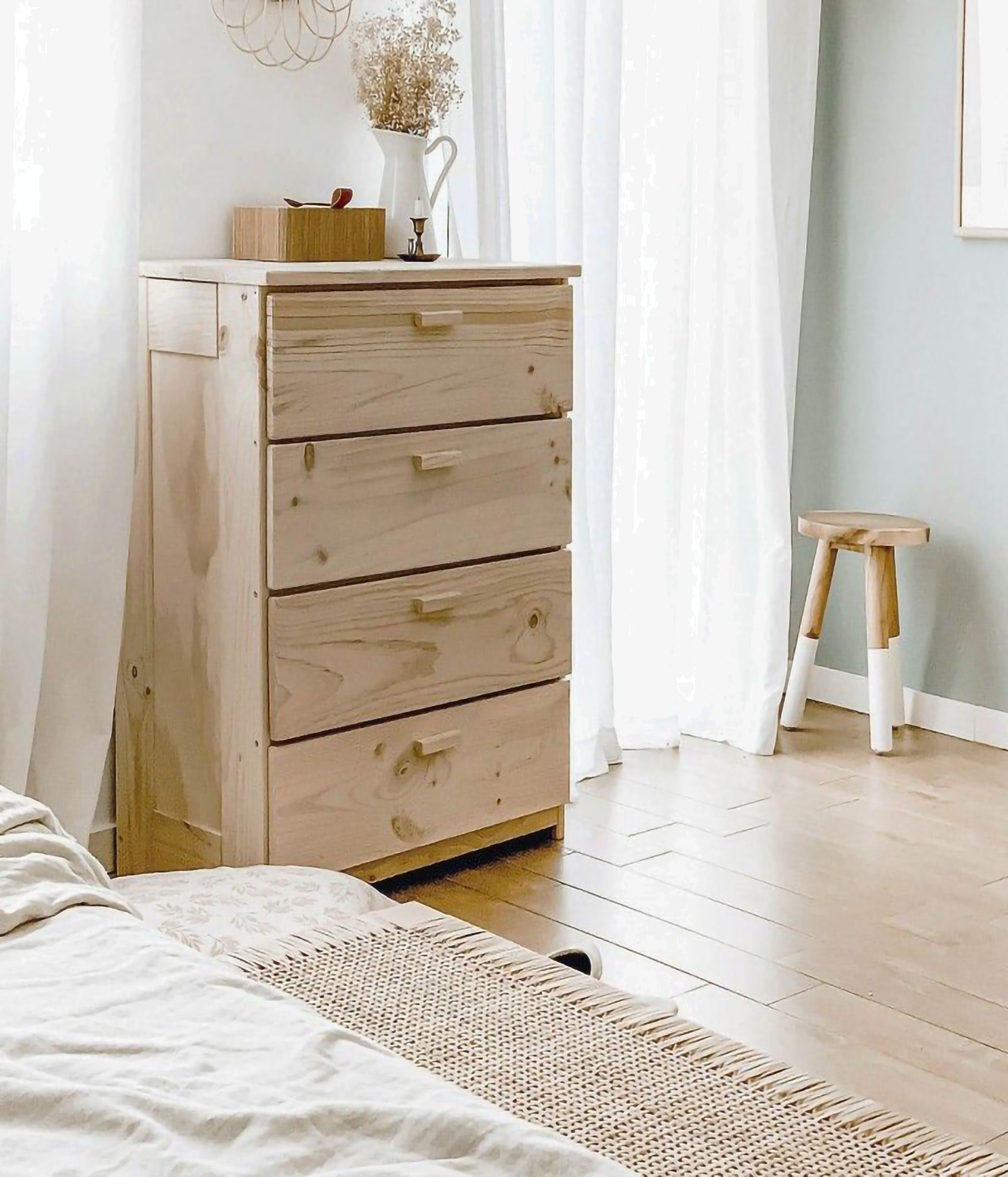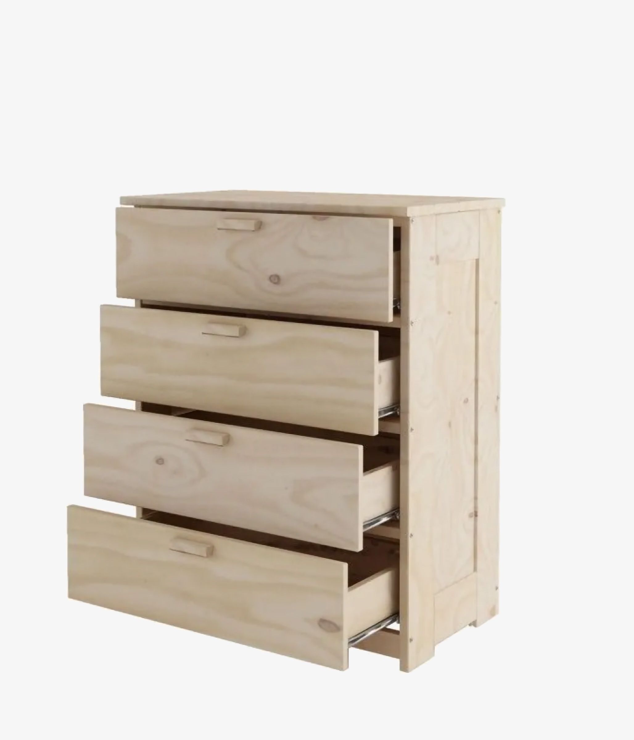 Esta cómoda de cuatro cajones está hecha de madera maciza de pino proveniente de plantaciones sostenibles.