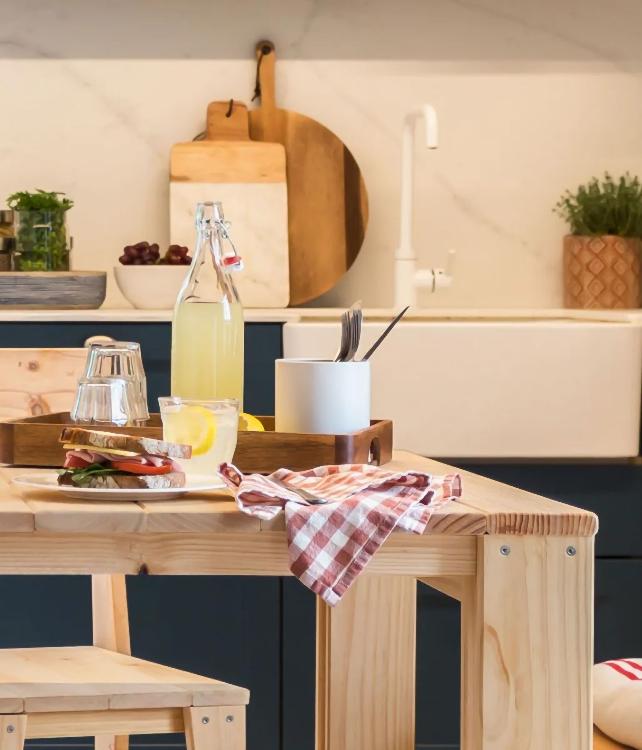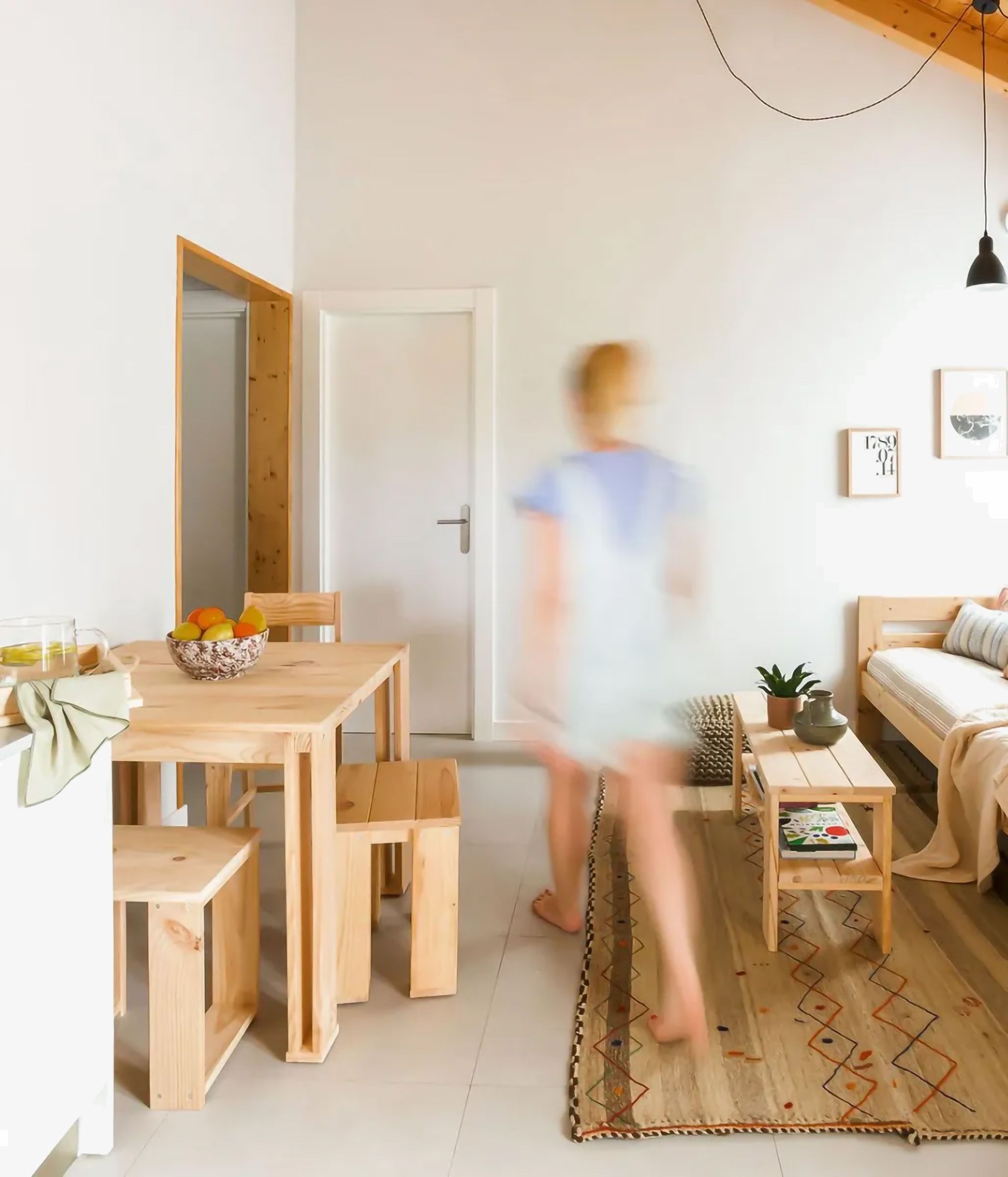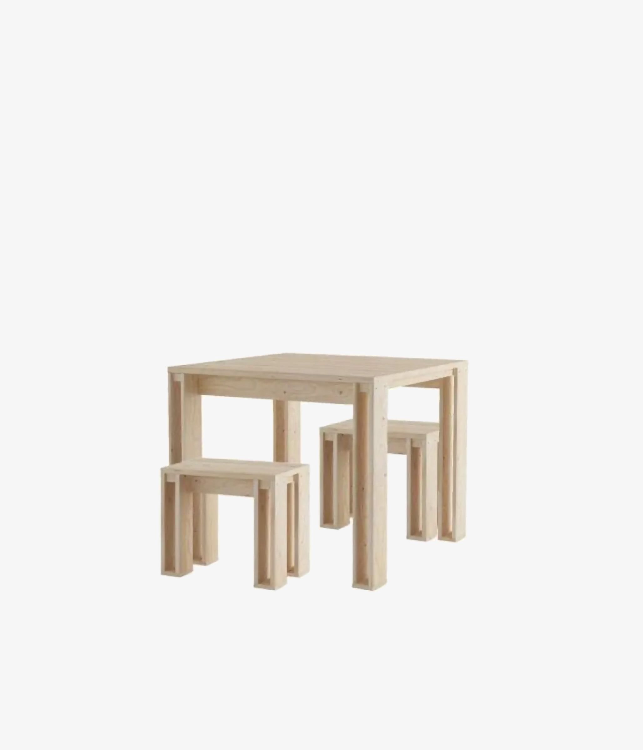 Conjunto de mesa y dos bancos fabricados en madera maciza de pino proveniente de plantaciones sostenibles.