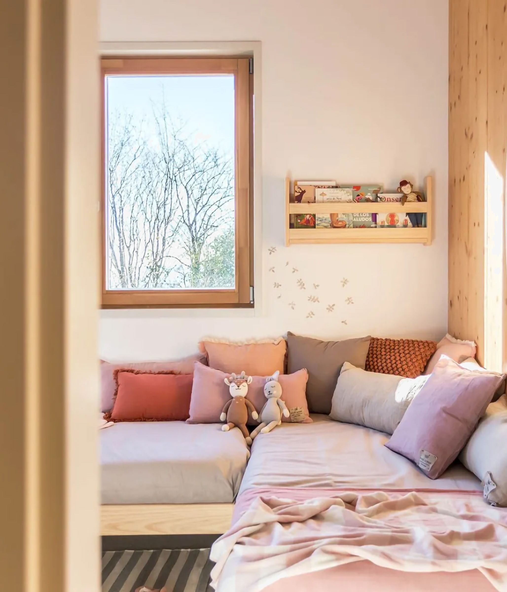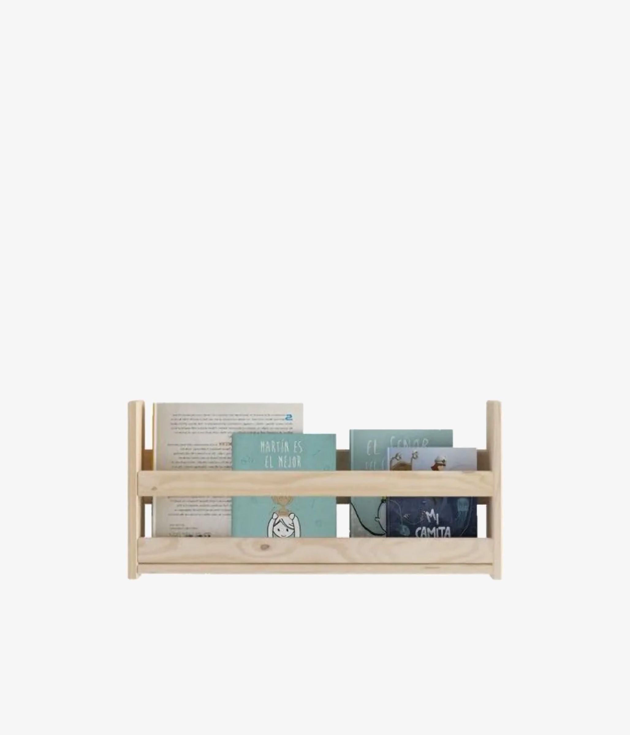 Estantería de una balda con barandilla fabricada en madera maciza de pino proveniente de plantaciones sostenibles.