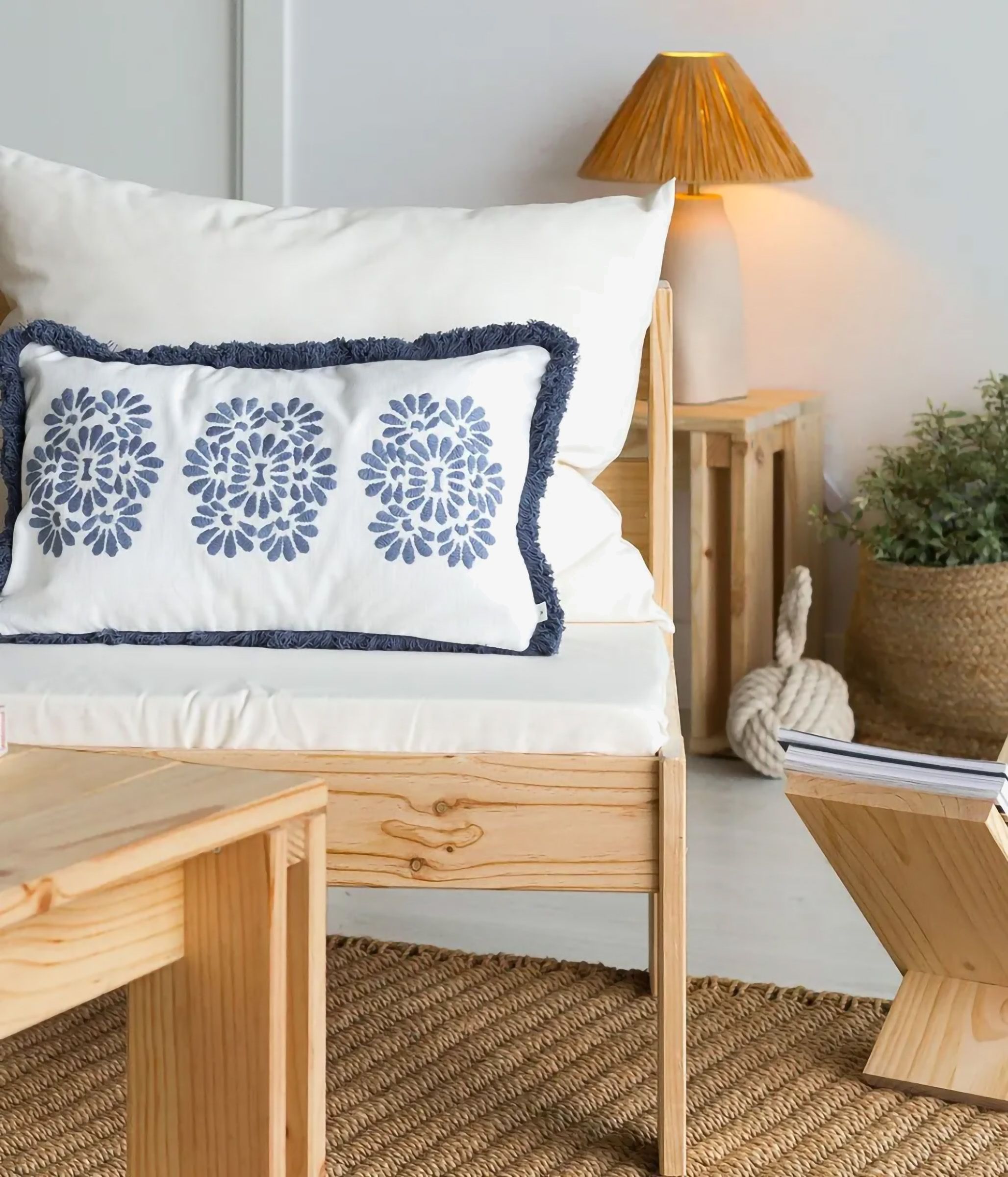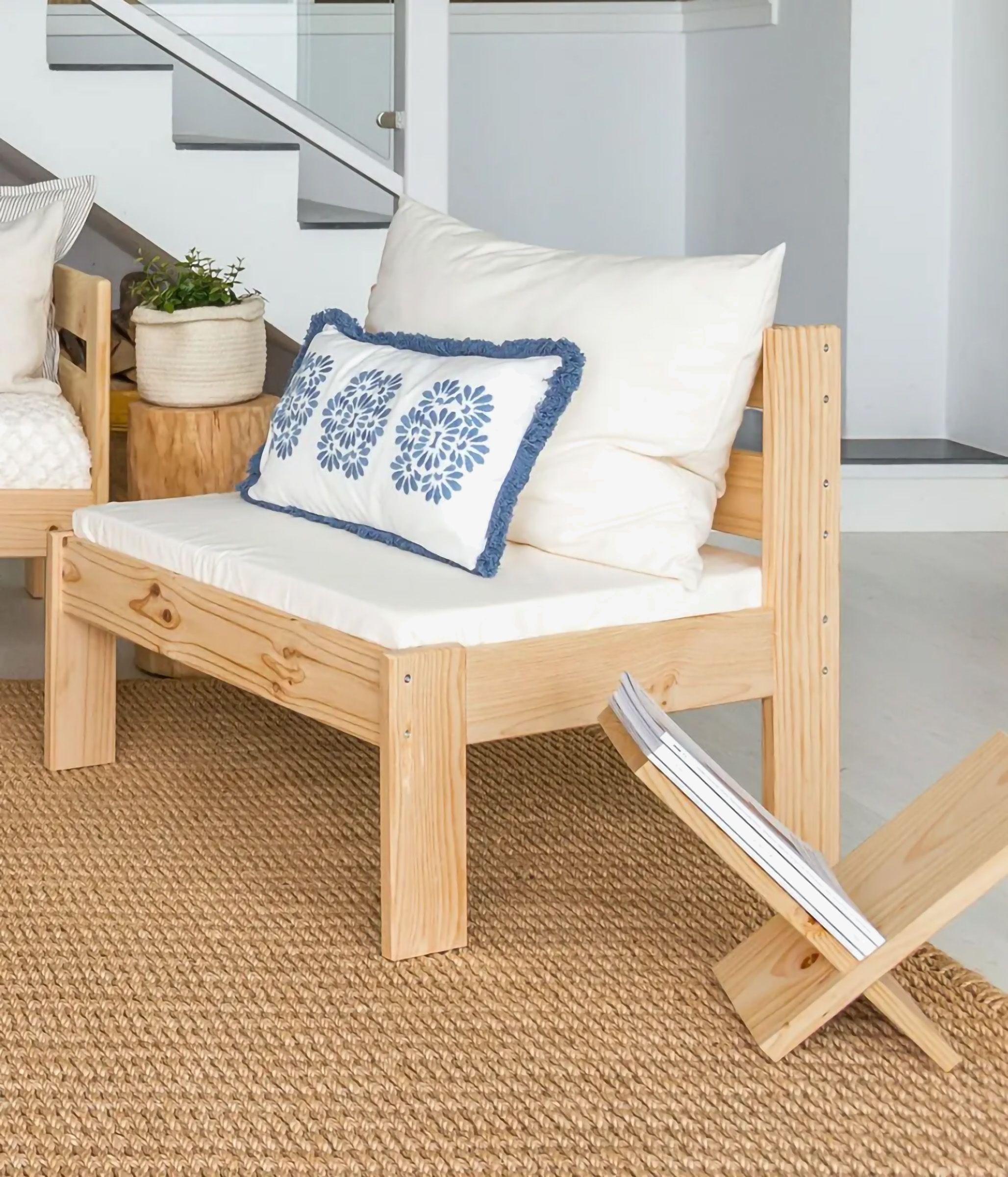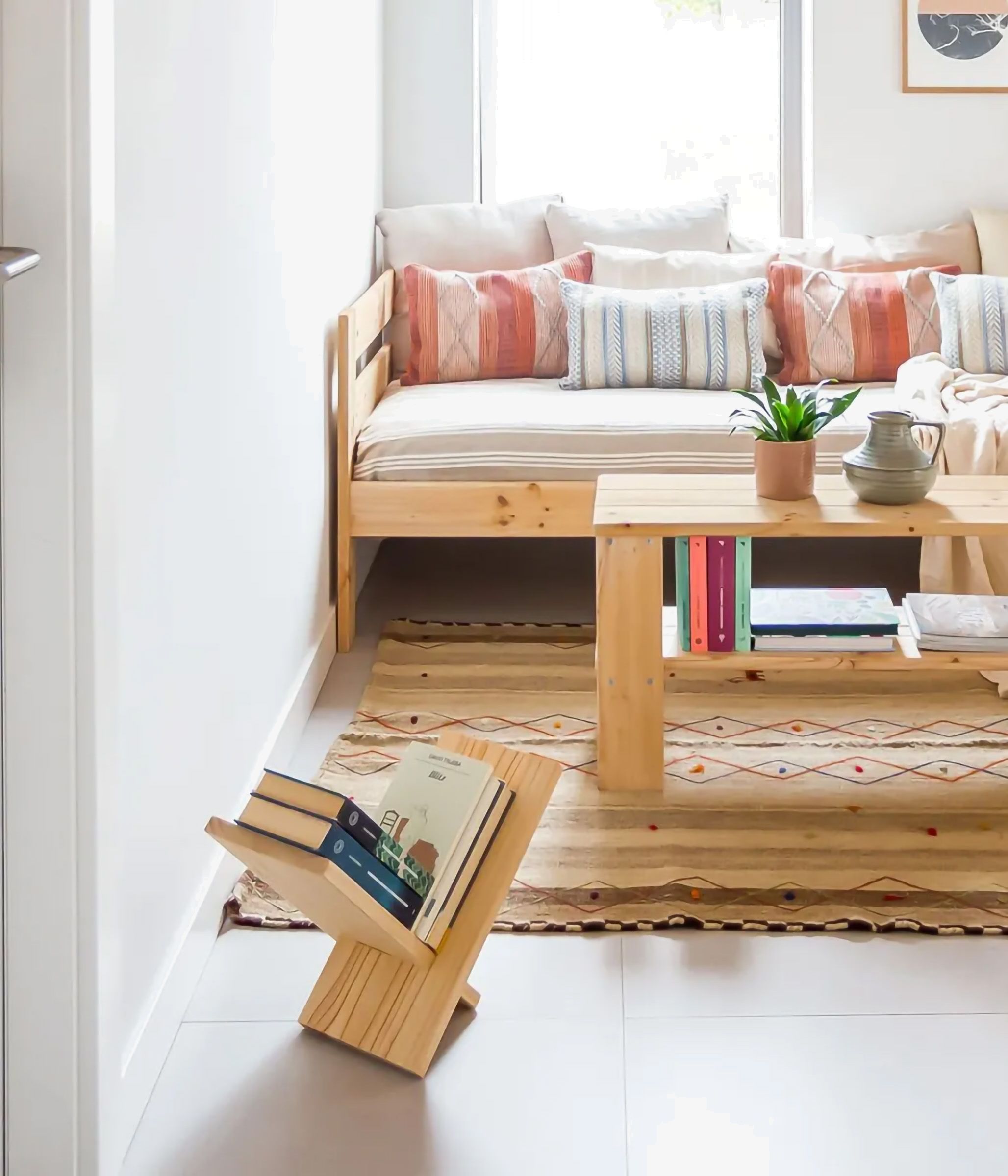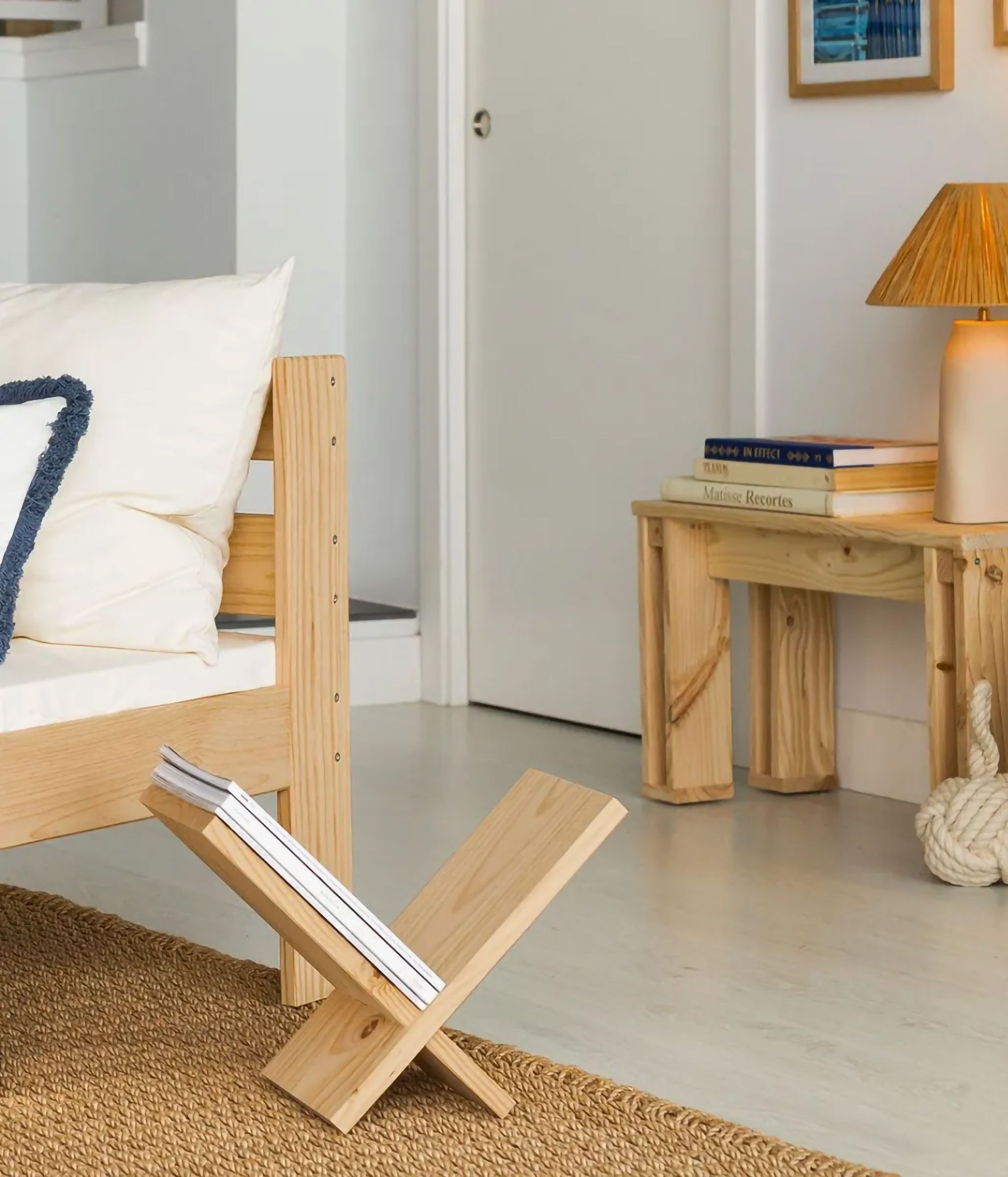 Revistero en forma de uve fabricado en madera maciza de pino proveniente de plantaciones sostenibles.